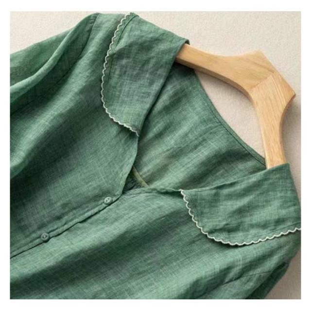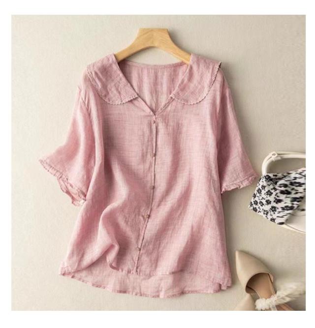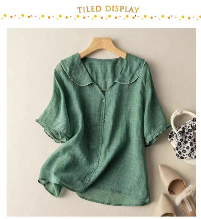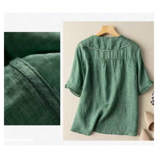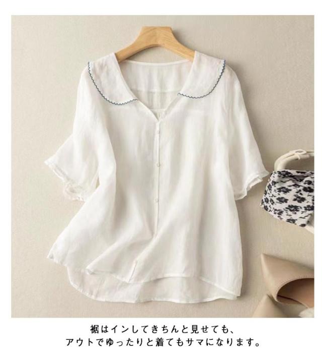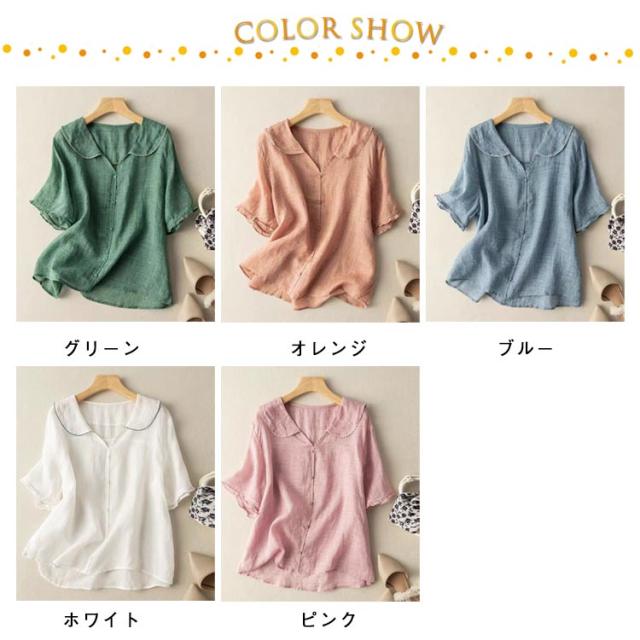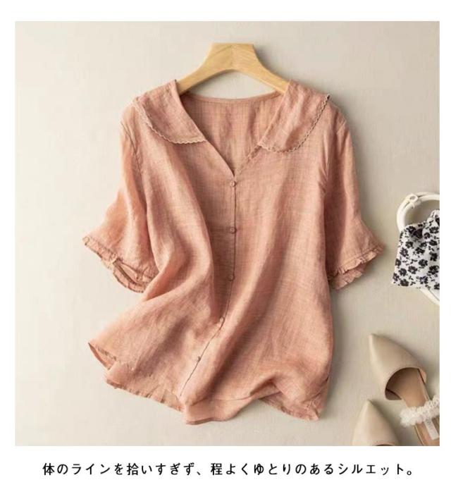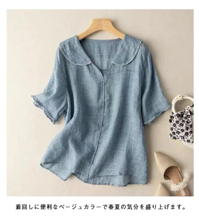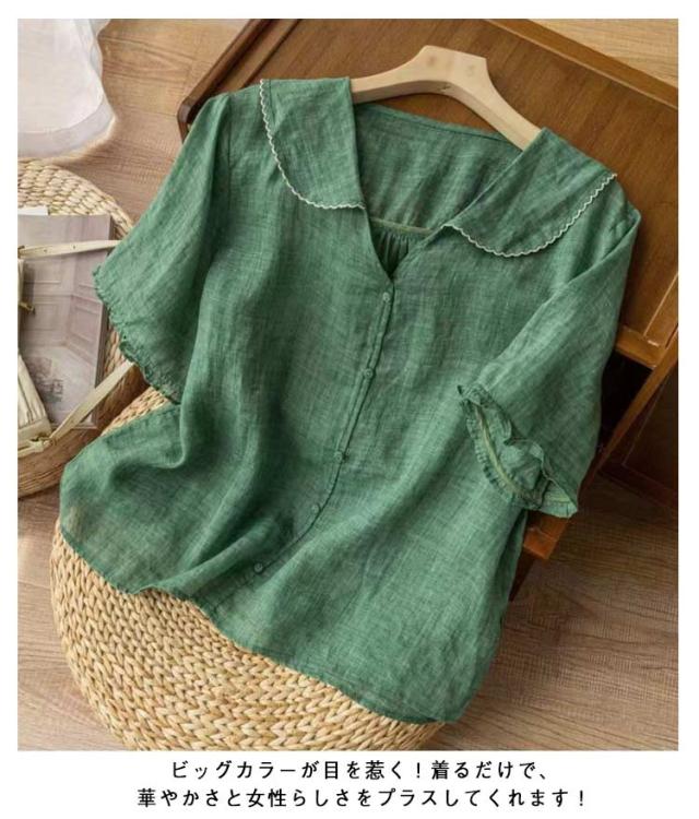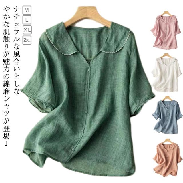 綿麻シャツ 前開き レディース シャツ シャツブラウス シャツ チュニック 襟付き 半袖 Vネック ビッグカラー ボタン付き リネンブラウス ブラウス ゆったり 無地 大人 おしゃれ ナチュラル