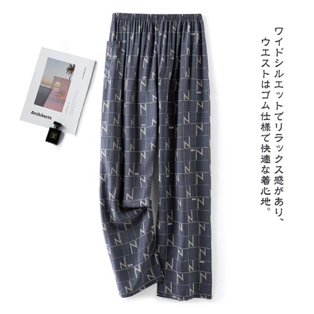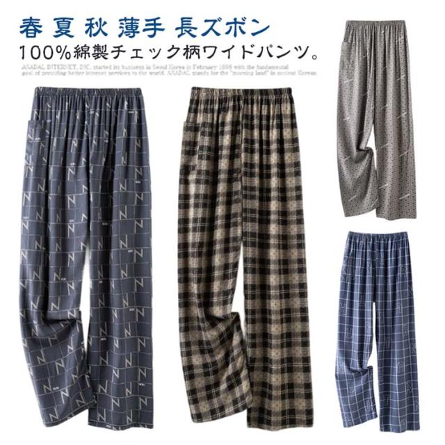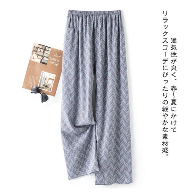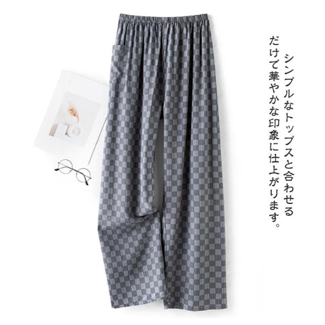 ロング ワイドパンツ パンツ ワイド 春 チェック ひんやり 秋 薄手 スラックス 夏 チェック 幾何学柄 100%綿 長ズボン パンツ ワイドパンツ チェック柄 涼しい ゆったり カジュアル ルームウェア ロングパンツ イージーパンツ