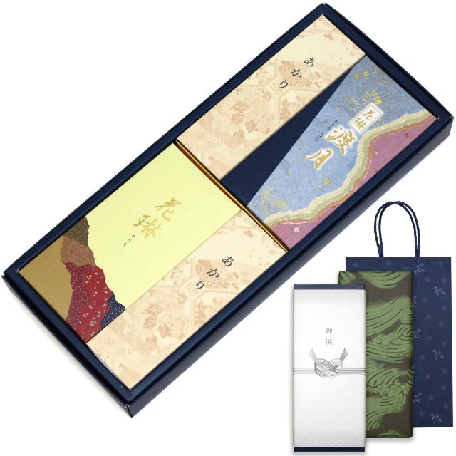 ■ 商品構成 ・花琳・渡月2種×各1箱 ・ロウソク(小箱入り) ・ギフト仕様の紙箱 ・線香の長さ:約13.5cm ・燃焼時間:約25分