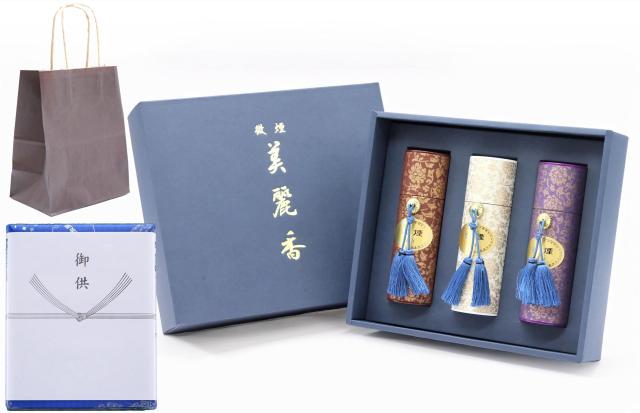 【持参用手提げ袋付き】お線香セット【美麗香三種香】白檀・沈香・香水の香り 煙の少ないお線香 包装・熨斗・喪中・新盆・喪中御見舞・ギ