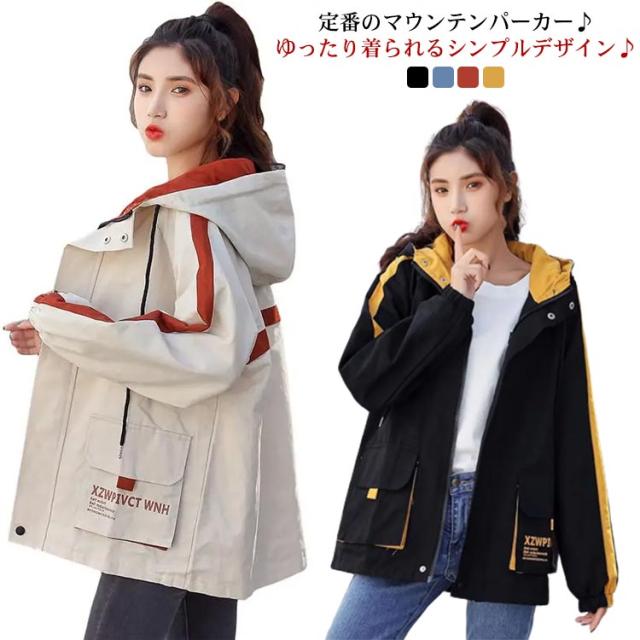 マウンテンパーカー レディース ジャケット ウインドブレーカー 春 ジャンパー 秋 ブルゾン ミドル丈 フード付き 中学生 高校生 長袖 アウター 韓国 原宿系 ファッション ゆったり 大きいサ BF