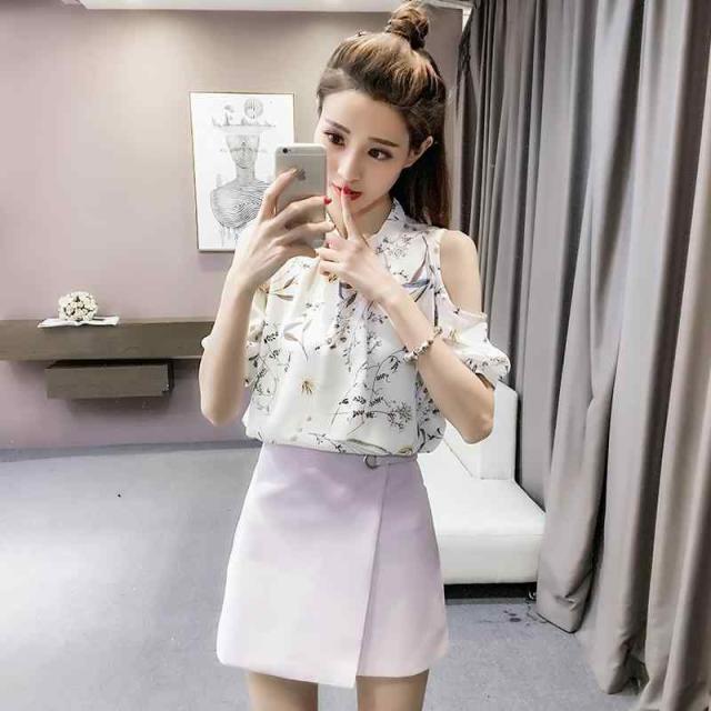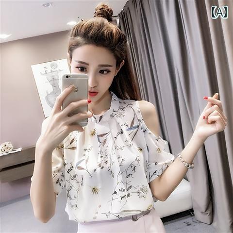 春 コーデ レディース ファッション オシャレ カワイイ シンプル きれいめ ナチュラル 上品カジュアル 婦人服 大きいサイズ オフショルダー 花柄 シフォン トップス 半袖 スリム シャツ 夏