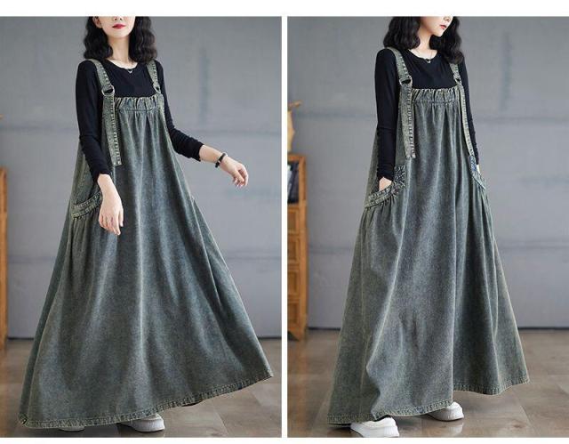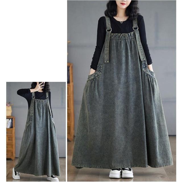 ワンピース デニム ジャンパースカート Aライン ジャンスカ カジュアル キャミワンピ 体型カバー ポケット スリット ロングスカート マタニティ 細見 フロントジップ