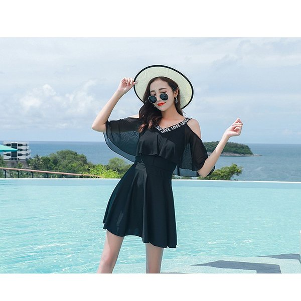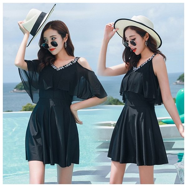 水着レディース 体型カバー 水着 ワンピース型 セパレート 肩出し 小胸バンドゥ 水着点セット フリル 韓国風 代 黒