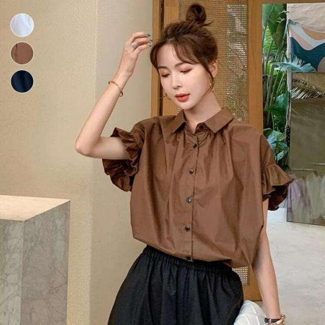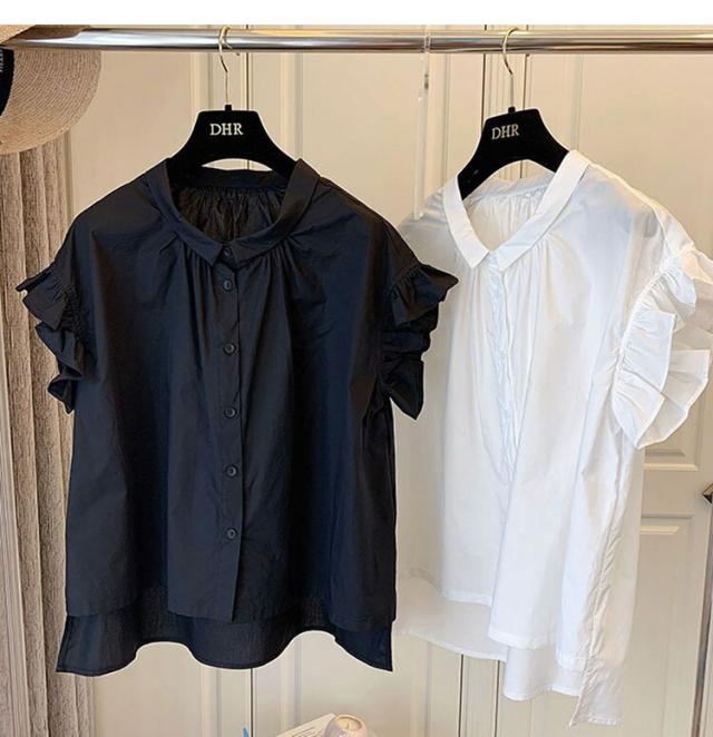 ボリューム袖 ブラウス トップス レディース 半袖 カットソー フリル フリルカットソー 可愛い きれいめ シンプル 体型カバー ゆったり 無地 春 夏 白 ホワイト 韓国 ファッション 黒