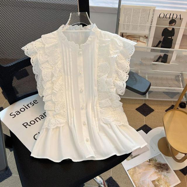 レースブラウス レディース ノースリーブ Vネック フリル ショート丈 ウエストマーク ペプラムトップス パンチングレース ブラウス シャツ チュニック カジュアル 体型カバー 無地 上品 エレガント