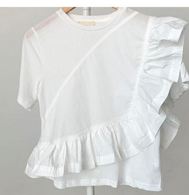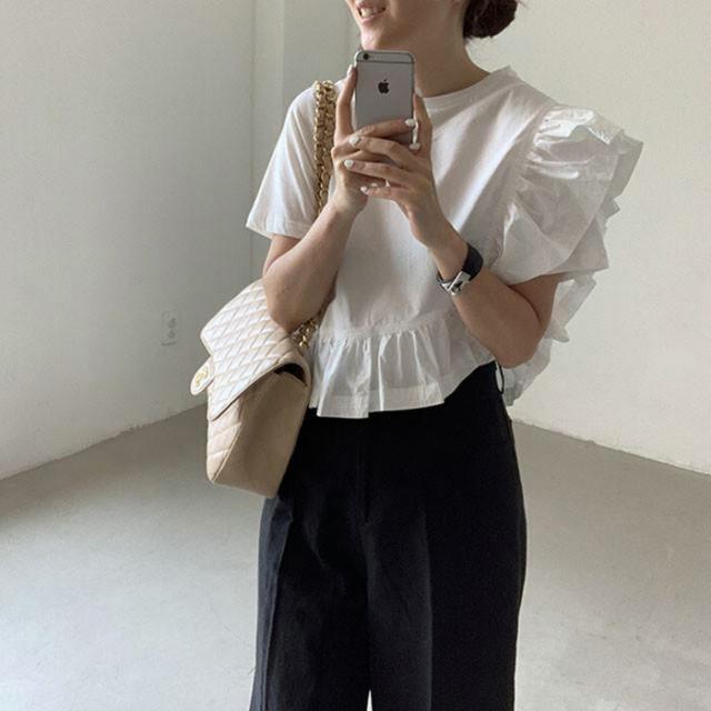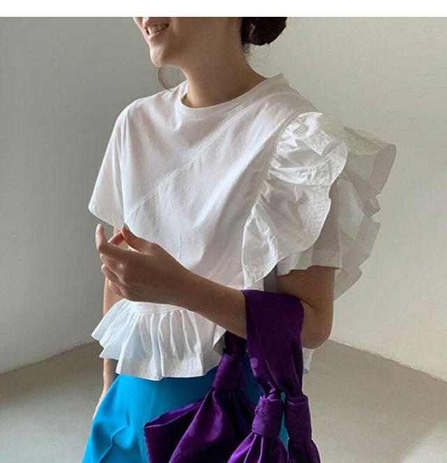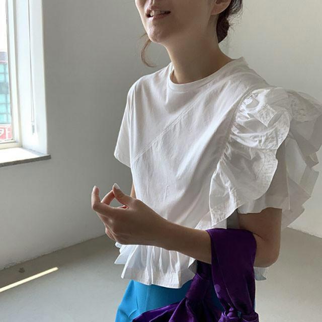 ブラウス レディース 半袖 フリル袖 Tシャツ 無地 トップス ホワイト フレア袖 春 秋 夏 きれいめ カットソー ゆったり オシャレ 着回し抜群 カジュアル 体型カバー 可愛い お洒落 ホワ 大人