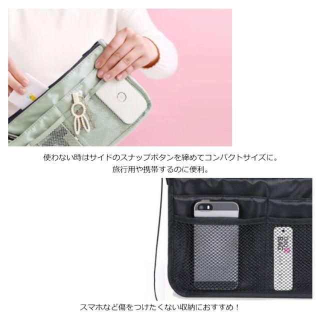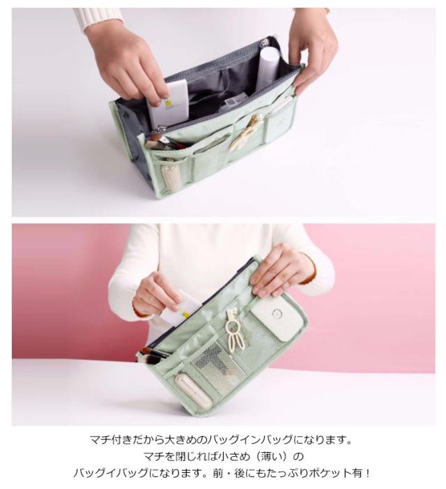 | 大きめのバッグインバッグをお探しの人はぴったりです。 マチ付きだから大きめのバッグインバッグになります。マチを閉じれば小さめ(薄い)のバッグイバッグになります。前・後にもたっぷりポケット有! メンズでも利用できるバッグインバッグ! 旅行や普段のお出かけ、通勤、通学などにもぴったりです。 鍵・携帯・化粧品・充電ケーブル・イヤホンなど小物がきれいにまとめれます。 外にも中にもたっぷり収納することができ、欲しいものをサッと取り出すことが可能。 | |