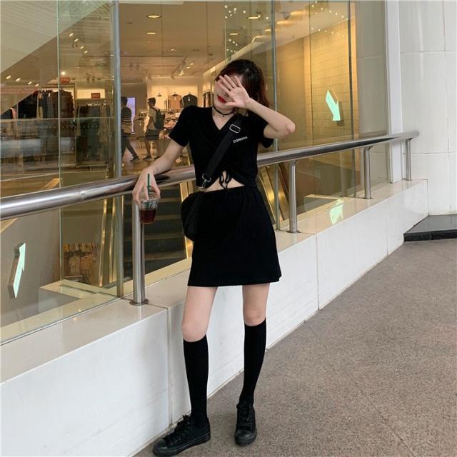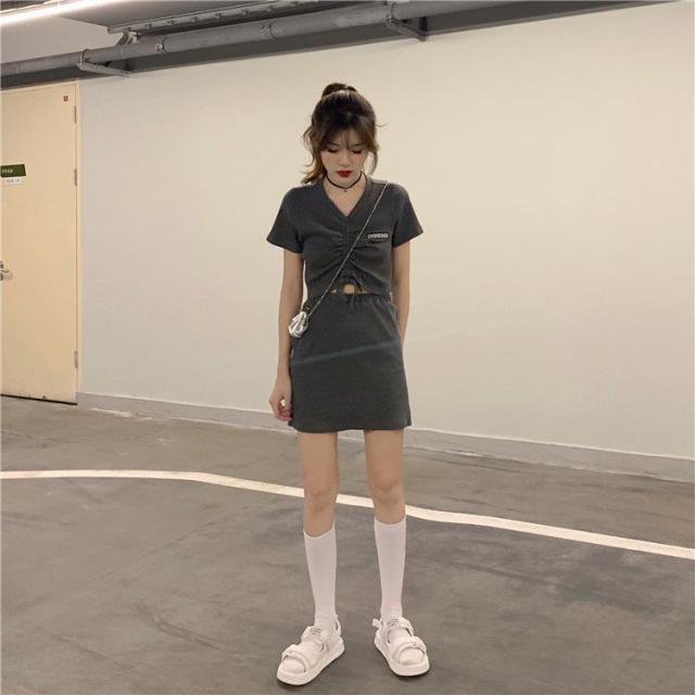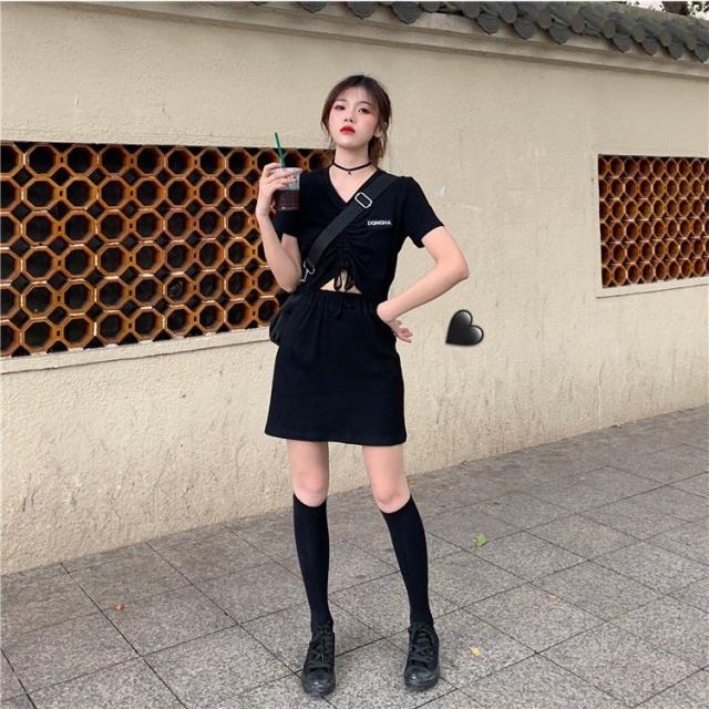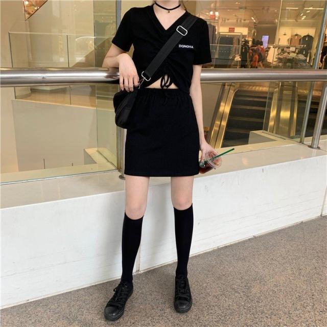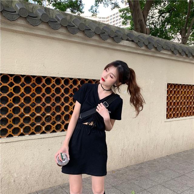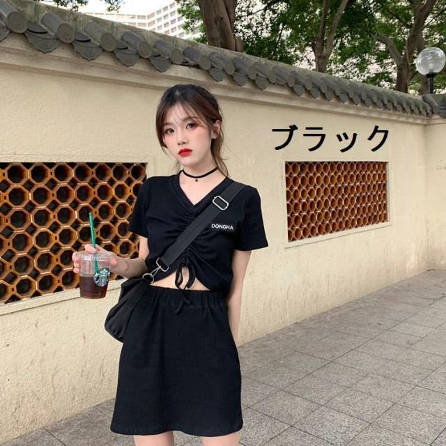 セットアップ カットソー Tシャツ スカート ミニスカート レディース Vネック 半袖 へそ出し 前絞り ドローストリング クロップド丈 上下セット