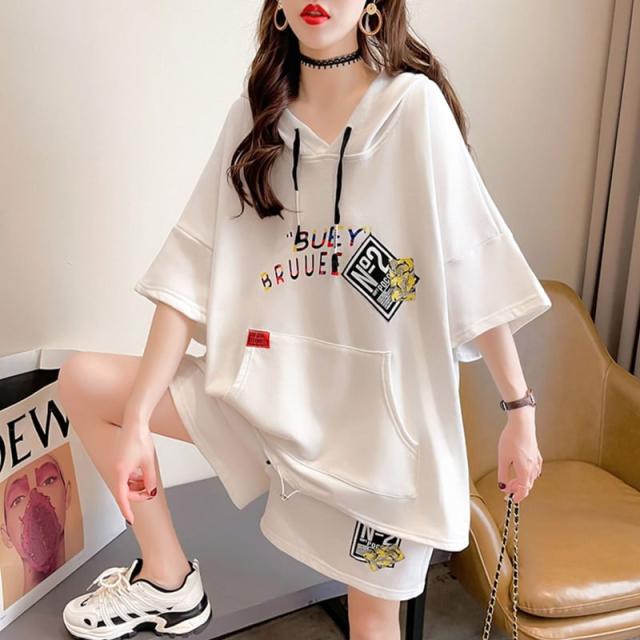 2点セット セットアップ トップス 半袖 パーカープルオーバー フード ロゴ ショートパンツ モード系 ショート pLegLad店 カジュアル 大人女子 かわいい ゆったり スポーツ 運動 ホワイト グレー 20代 30代