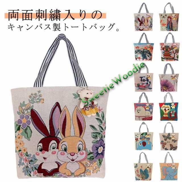 刺繍入り 小熊飾り付属!キャンバス 可愛い 動物柄 トートバッグ かわいい 小熊飾り付属!キャンバス A4 雑誌入れ 買い物バッグ ナチュラル 女性 通勤 通学