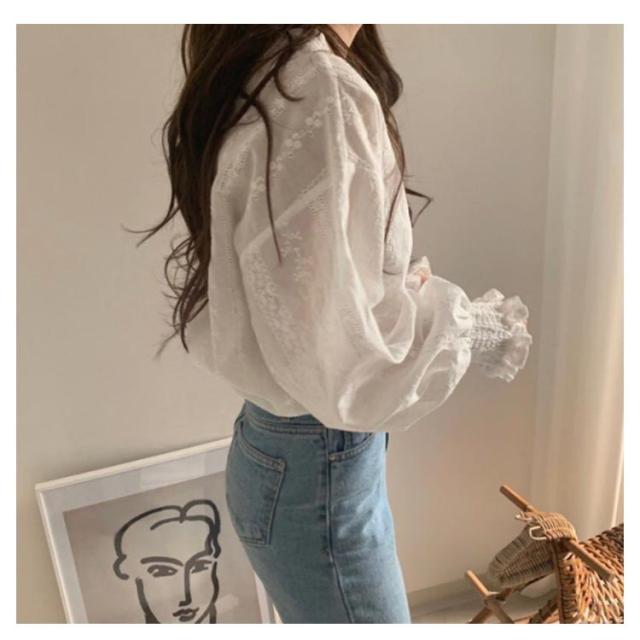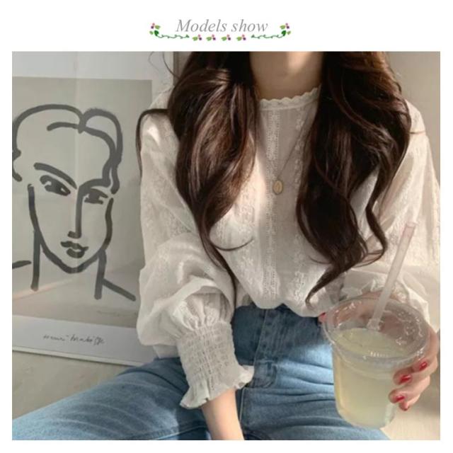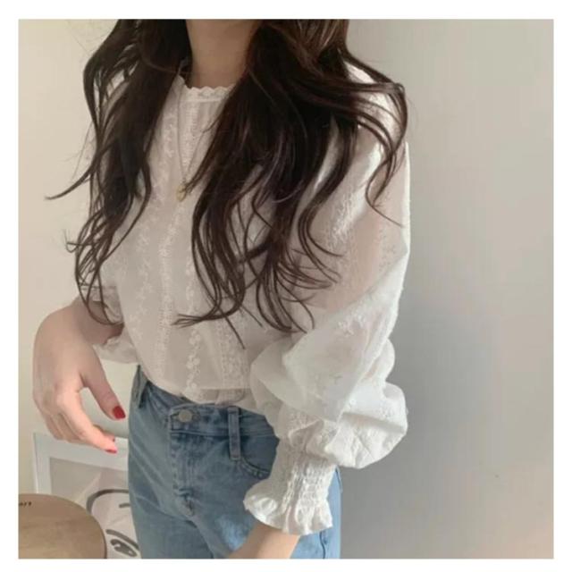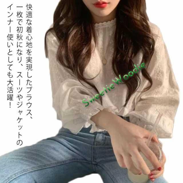 ブラウス フェミニン 大人 オフィス ボリューム袖 レースブラウス パフスリーブ 透け感 女性 チュール 長袖 可愛い レース レディース フリルシャツ トップス 無地 カジュアル きれいめ ファッション 秋 春 通勤 フリル襟