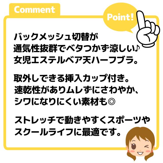 【送料無料】女児 ジュニア バックメッシュ ハーフブラ 挿入カップ エステルベア天 通気性 速乾 ストレッチ 下着 子供 女の子 140cm 150cm 160cm 165cm yg-3013【メール便対応】