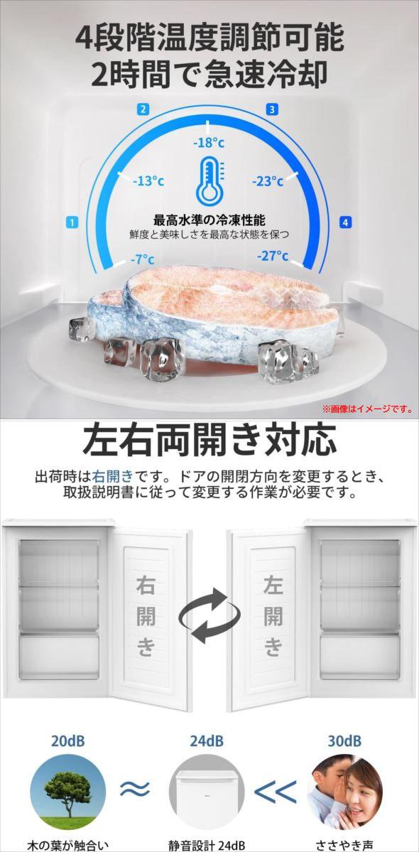 【商品特長】 ◆大容量設計、便利な分類収納 容量100Lで、3つの透明トレーが付属しています。一目で庫内の食品を確認でき、整理整頓しやすい設計です。 大容量でありながら、食品の取り出しも簡単で、日々の利用に便利です。 ・前開き式ケース×2 奥にある食材もスムーズに取り出せます。また、蓋付きなので雑菌やホコリの侵入を防ぎ、 扉の開閉によって庫内温度をしっかりキープします。 ・引き出し式ケース×1 中身が一目で分かり、簡単に取り出せます。外気の侵入を抑え、冷気が外に漏れにくい設計です。 ◆4段階温度調整&急速冷凍 4段階の温度調整が可能で、2時間で急速冷凍ができます。3D冷風循環システムを搭載し、庫内全体を均一に冷却。 肉や魚などの細胞破壊を防ぎ、風味や栄養素の損失を最小限に抑えます。 冷凍後も鮮やかな色合いと美味しさを保つ優れた性能を提供します。 ◆耐久性と静音性の両立 上部は最大30kgの荷重に耐え、電子レンジや調理家電を設置可能。トレーは耐熱温度100℃まで対応し、 長期間使用しても変形しにくい高耐久設計です。さらに、動作音はわずか26dBと非常に静かで、 リビングや寝室でも快適に利用できます。 | |||||||||||||||||||||||||||