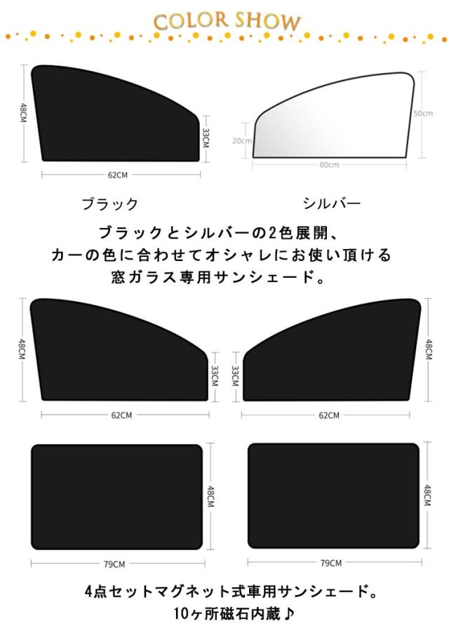 | 4点セットマグネット式車用サンシェード。10ヶ所磁石内蔵♪ 遮光遮熱用だけでなく、車内の様子も遮断できるので盗難防止などの防犯対策にもなります。車中泊や仮眠時にもオススメ 車内日焼け防止カーテン、冷房効率アップし、快適な車内空間◎革や樹脂パーツの色あせや劣化を抑えられます♪ 1枚に10ヶ所強力磁石内蔵で、しっかりとくっつきます。 ブラックとシルバーの2色展開、カーの色に合わせてオシャレにお使い頂ける窓ガラス専用サンシェード。 ご注意:窓枠上部に金属部分がない、またが金属部分が狭い場合は取付できません。 | |