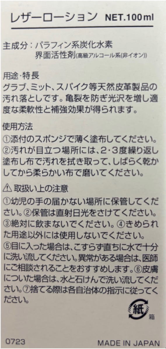 | 特徴 | グラブ、ミット、スパイク等天然皮革製品の汚れ落としです。 亀裂を防ぎ光沢を増し適度な柔軟性と補強効果が得られます。 汚れ落とし、ツヤ出し効果もあります。 グラブのお手入れにおすすめです。 安心の日本製。 |