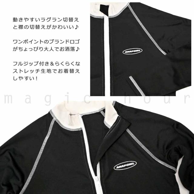 ◆ ラッシュガード キッズ ジュニア ガールズ 長袖 ANAP アナップ UVカット フルジップ フードなし ラッシュ UPF50+ ◆