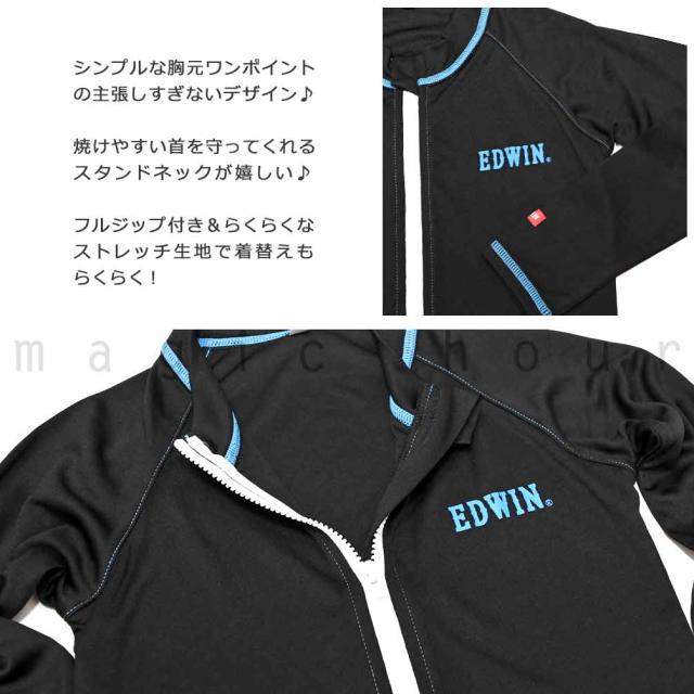 検) EDWIN エドウィン ブラック ブルー ネイビー スクール ロゴ ワンポイント 子供用 スポーツ 日焼け防止 紫外線対策 男子 スタンドネック フルジップ プール スイミング 水泳 スイムウェア 高学年 小学生