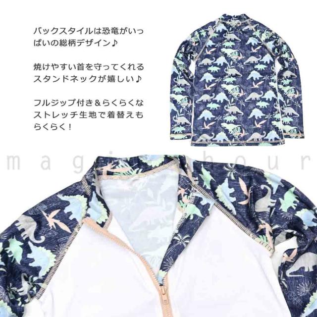 送料無料 ラッシュガード ジュニア 子供 長袖 UVカット ブランド ブランド ジップアップ フルジップ 水着 男の子 ボーイズ UPF50+ 速乾 白 恐竜 120 130 140cm