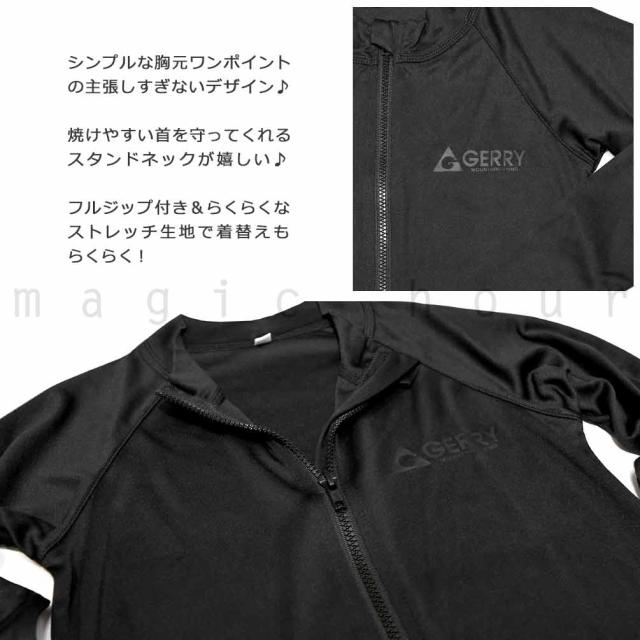 検) GERRY ジェリー ブラック ブルー ネイビー スクール ロゴ ワンポイント 子供用 スポーツ 日焼け防止 紫外線対策 男子 スタンドネック フルジップ プール スイミング 水泳 スイムウェア 高学年 小学生
