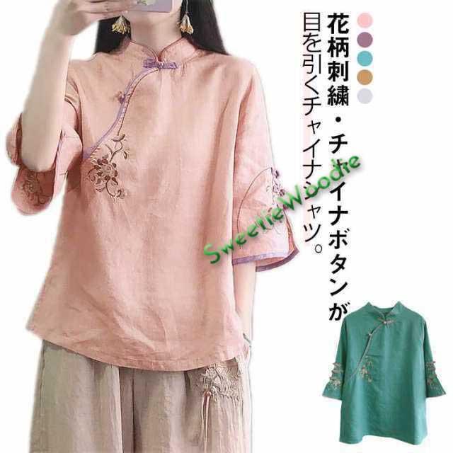 チャイナシャツ レディース 綿麻 エレガント トップス チャイナ風 刺繍 ブラウス リネンブラウス 七分袖 チャイナボタン 前開き 花柄 薄手 プルオーバー スタンドカラー ボリューム袖 中国風 ゆったり ナチュラル 大人 カジュアル リネン混 春 刺繍