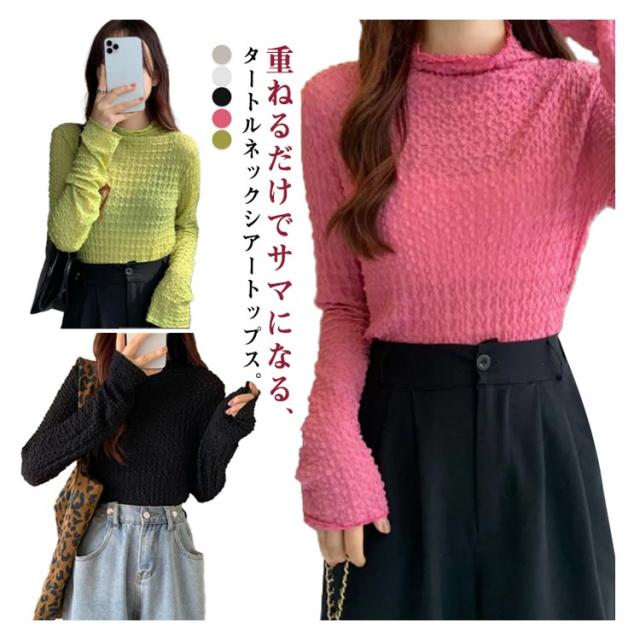 | 重ねるだけでサマになる、タートルネックシアートップス。 凹凸感のあるストレッチ素材で、体のラインが綺麗に出る! 薄手のシースルー素材で、女性らしくセクシーな雰囲気。 伸縮性があるので、タイトでも締め付け感のない着心地も嬉しい。 ロングスリーブデザインもポイント。きれいめにもカジュアルにも◎ セーターやジャケット等のインナーとしても可愛い。発表会やお食事会等のフォーマルにも、おススメ。 | |
