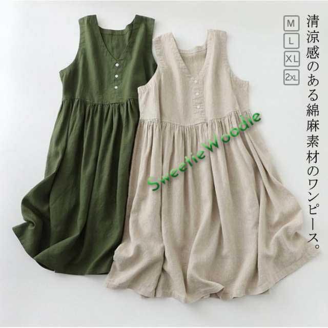 綿麻 ワンピース 春夏 体型カバー ワンピ ロングワンピース ノースリーブ 膝下丈 Vネック 麻混 コットンリネン ワンピース ウエストギャザー 大きいサイズ ゆったり リネン混 きれいめ ナチュラル 夏 春 涼しい