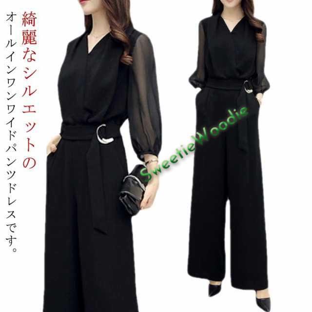 パンツドレス オケージョン ウエストゴム 入学式 セレモニー 二次会 発表会 ドレス お呼ばれ 結婚式 ワイド パンツ お呼ばれ 袖あり パンツスタイル 女子会 体型カバー 七五三 30代 40代 七分袖 20代 ブラック レディース オールインワン