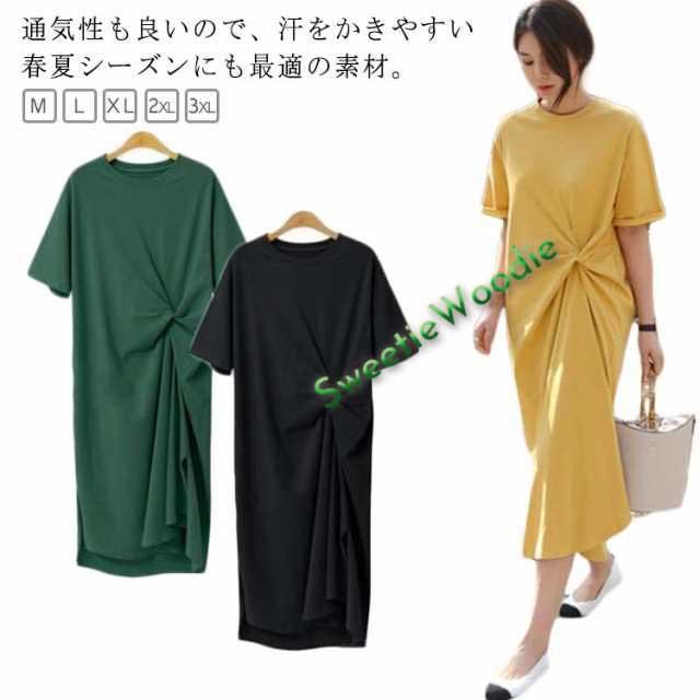 着やせ レディース Tシャツワンピース ワンピース イエロー 半袖 アシメ フリル ギャザー 夏 春夏 細見え 体型カバー ミモレ丈 夏服 Aライン 部屋着 らくちん 大きいサイズ フェミニン カジュアル ブラック ロングTシャツ