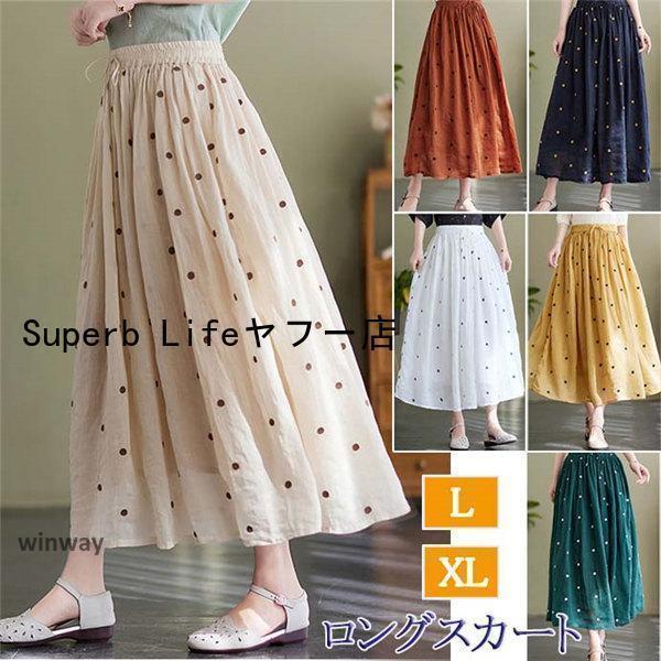 フレアスカート リネン スカート 水玉 ロングスカート 綿麻 レディース フレアスカート大きいサイズ aライン 体型カバー 膝下 春 夏 秋