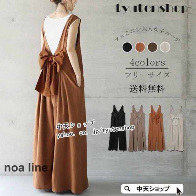 サロペットパンツ レディース サロペット 40代 50代 オールインワン綿麻 ロング丈 ワイドパンツ ゆったり 体型カバー リボン バックシャン 気質 大人 春夏新作