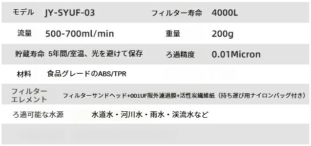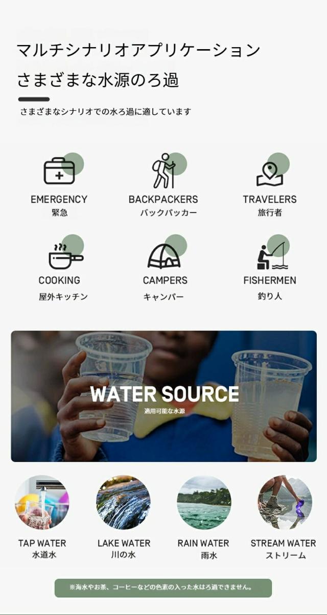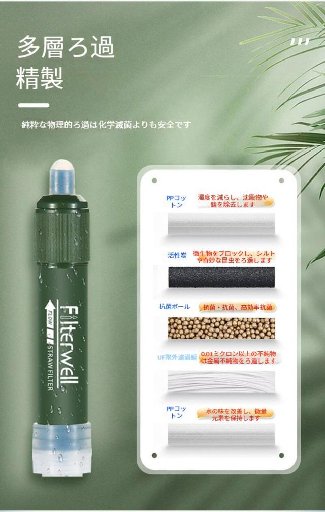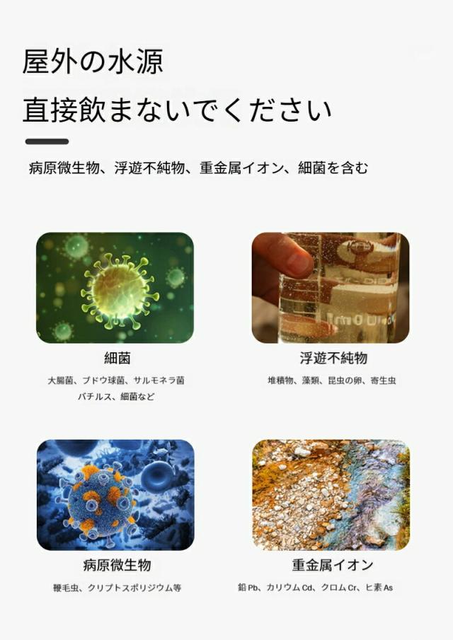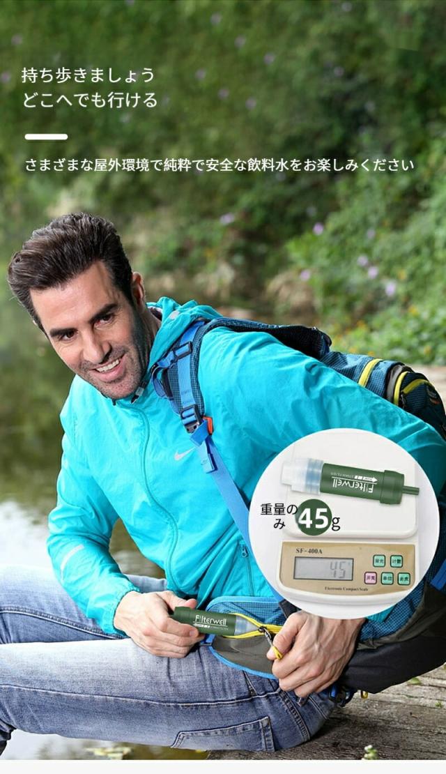商品情報商品詳細説明アウトドア、キャンプ、登山、サバイバルに最適な携帯型フィルター付きストローです。水源が不明な場所でも、このストローを使えば簡単にきれいな水を直接飲むことができます。フィルターは高性能で、細菌や不純物を取り除き、安全な水を提供します。携帯に便利で、かさばらず軽量。この直飲み浄水器は、災害時や緊急時にも活躍し、アウトドア愛好者にとっては必須アイテム。水を簡単にろ過し、必要な時に清潔で飲みやすい水を提供。取り外し可能なフィルターは長期間使用可能で、安心して利用できます。持ち運びに便利で、軽量設計なのでバックパックに収納しても場所を取らず、キャンプや旅行時に最適です。自分の飲み水を確保し、どんな状況でも安心して過ごせます。