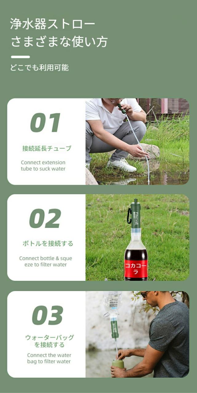 | 商品詳細説明 | アウトドア、キャンプ、登山、サバイバルに最適な携帯型フィルター付きストローです。水源が不明な場所でも、このストローを使えば簡単にきれいな水を直接飲むことができます。フィルターは高性能で、細菌や不純物を取り除き、安全な水を提供します。携帯に便利で、かさばらず軽量。 この直飲み浄水器は、災害時や緊急時にも活躍し、アウトドア愛好者にとっては必須アイテム。水を簡単にろ過し、必要な時に清潔で飲みやすい水を提供。取り外し可能なフィルターは長期間使用可能で、安心して利用できます。 持ち運びに便利で、軽量設計なのでバックパックに収納しても場所を取らず、キャンプや旅行時に最適です。自分の飲み水を確保し、どんな状況でも安心して過ごせます。 |