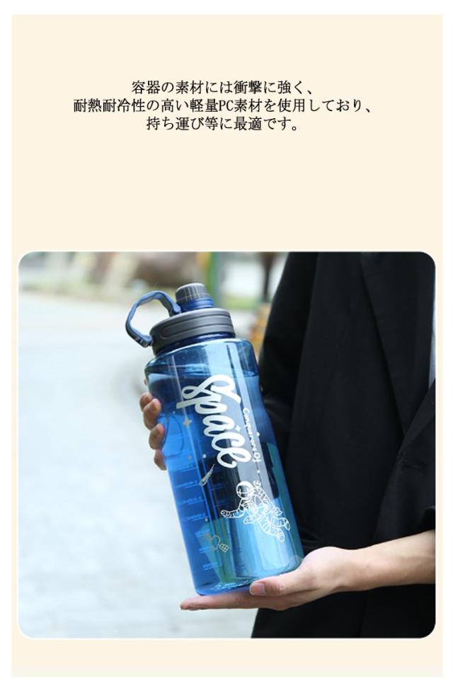 | 【1000ml 1500ml 2000ml 3000ml】【目盛り付き】【ウォーターボトル】 毎日の水分補給をサポートする軽量なWATER BOTTLE。 持ち手がいており、軽量で持ち運びに便利です。 容器の素材には衝撃に強く、耐熱耐冷性の高い軽量PC素材を使用しており、持ち運び等に最適です。 高い密封性設計で、漏れ防止のキャップが付いています。鞄に入れて横にして持ち運んでも大丈夫です。 通学通勤はもちろん、部活、キャンプ、ハイキング、アウトドアスポーツ、フィットネス、ヨガ、サイクリング、スポーツ、釣り、バーベキューなどに非常に適しています。 | |