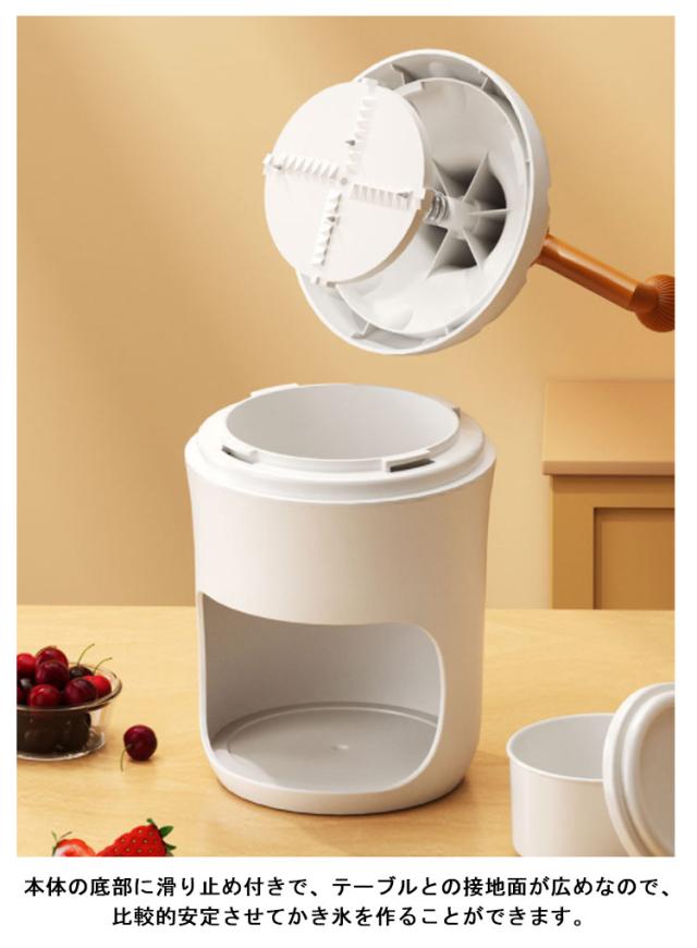 | 付属の製氷カップで作った氷をケースに入れてハンドルを横に回すだけ!手回しすることで、自分のペースでかき氷を作ることができます。 夏を涼しく過ごす、ひんやり美味しいかき氷!操作が簡単で使いやすいため、子供から大人まで幅広い年齢層に人気があります。 電源が不要なため、アウトドアやお祭りなどの場所でも使えます。 業者が作った砂氷には多くの添加剤があり、体の健康に有害である可能性がありますが、家で製造するには、原料から機械まで自分で選らんでいます。健康の安全を心配する必要はありません。 本体の底部に滑り止め付きで、テーブルとの接地面が広めなので、比較的安定させてかき氷を作ることができます。 本体は分解可能なので、お手入れが簡単で丸洗い可能です。 | |