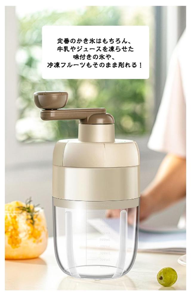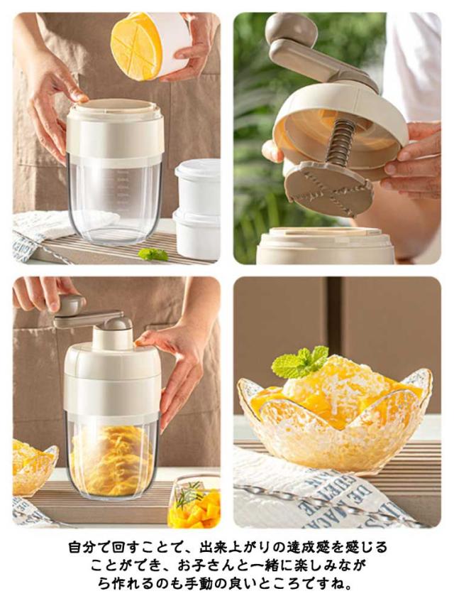| きめ細やかなふんわりとした雪のようなかき氷が作れるかき氷メーカーです! 大人も子供も楽しめる家庭用のかき氷器なので、おうちにもアウトドアにも楽しめます!牛乳を凍らせて、台湾風ふわふわかき氷をお楽しみください! 定番のかき氷はもちろん、牛乳やジュースを凍らせた味付きの氷や、冷凍フルーツもそのまま削れる! 手動式かき氷メーカーはハンドルを回すことで、スピードや圧力を「手加減」で微妙にコントロールすることができます。 自分で回すことで、出来上がりの達成感を感じることができ、お子さんと一緒に楽しみながら作れるのも手動の良いところですね。 | |