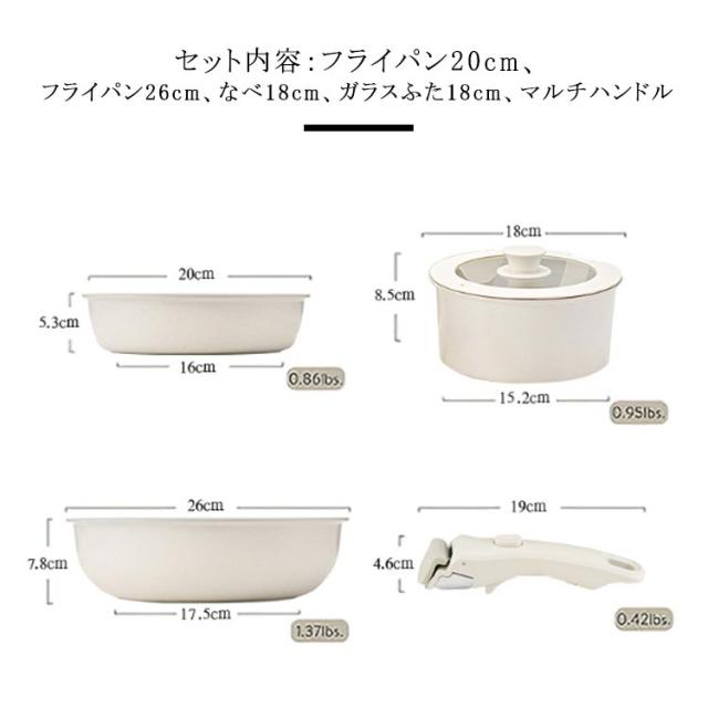 | サイズについての説明 | セット内容:フライパン20cm、フライパン26cm、なべ18cm、ガラスふた18cm、マルチハンドル |
