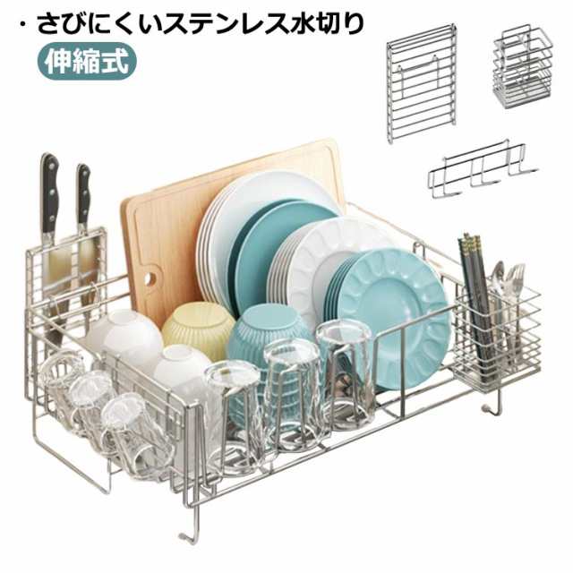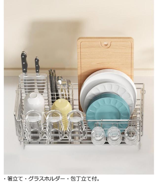 水切りラック スライド式 水切りかご シンクサイド ステンレス 水切りバスケット 箸置き付き 包丁立て 斜めトレー コップ立て