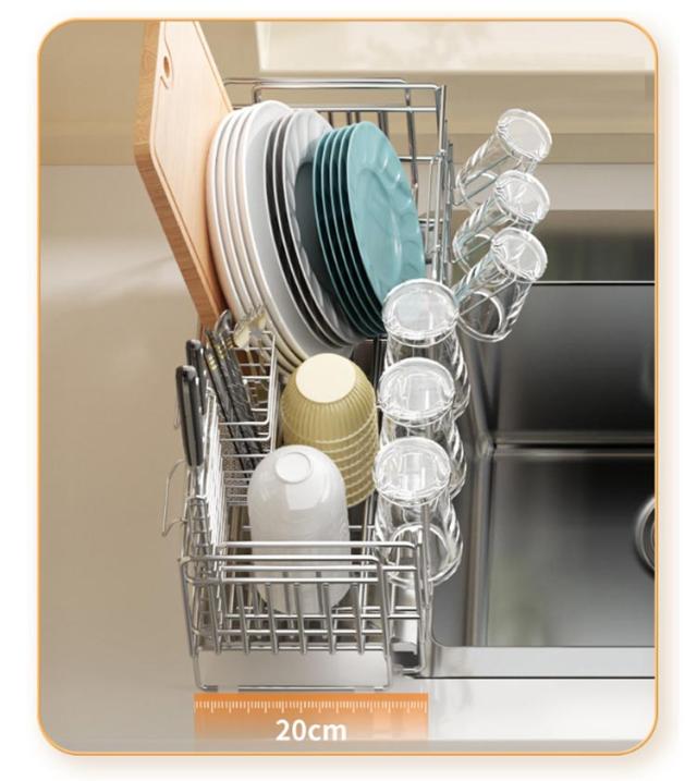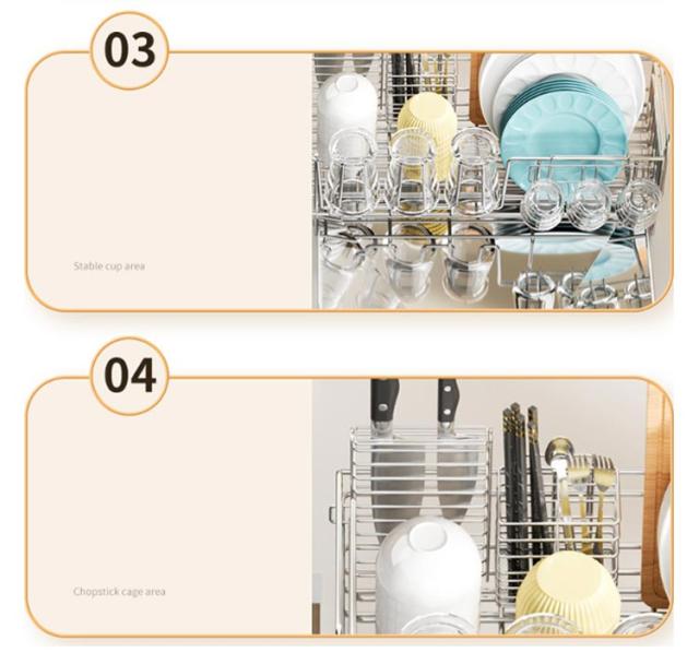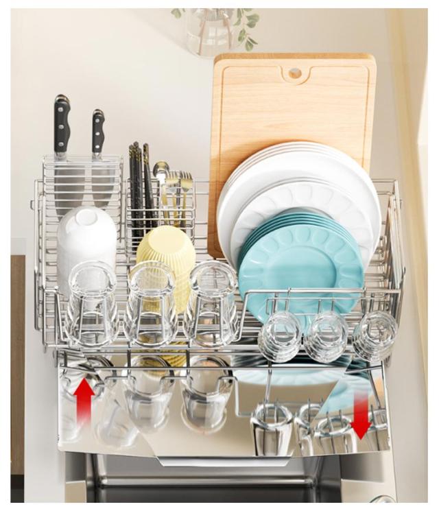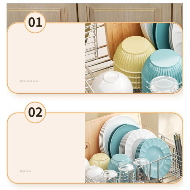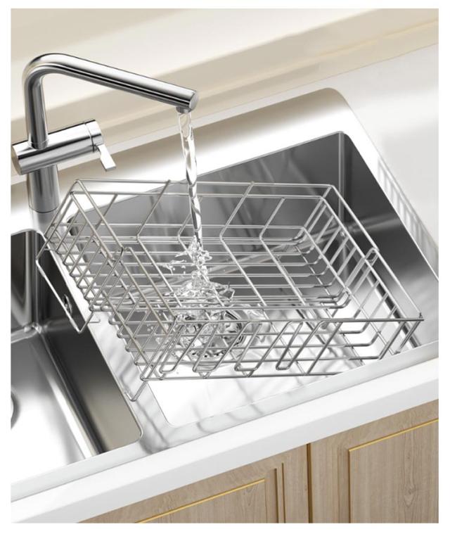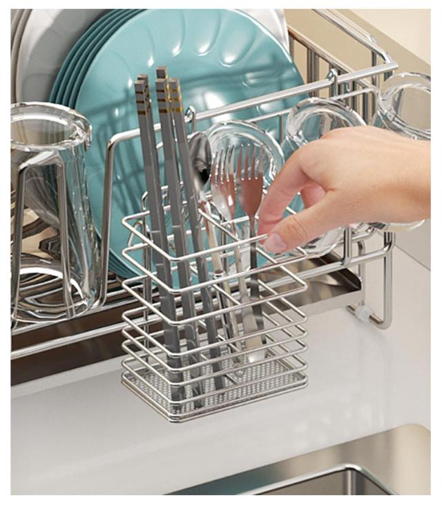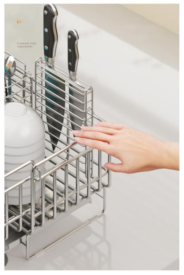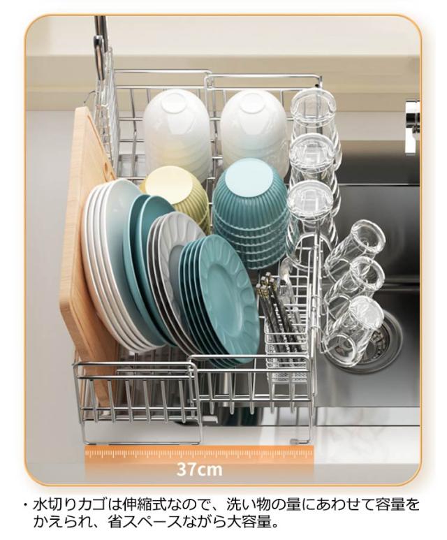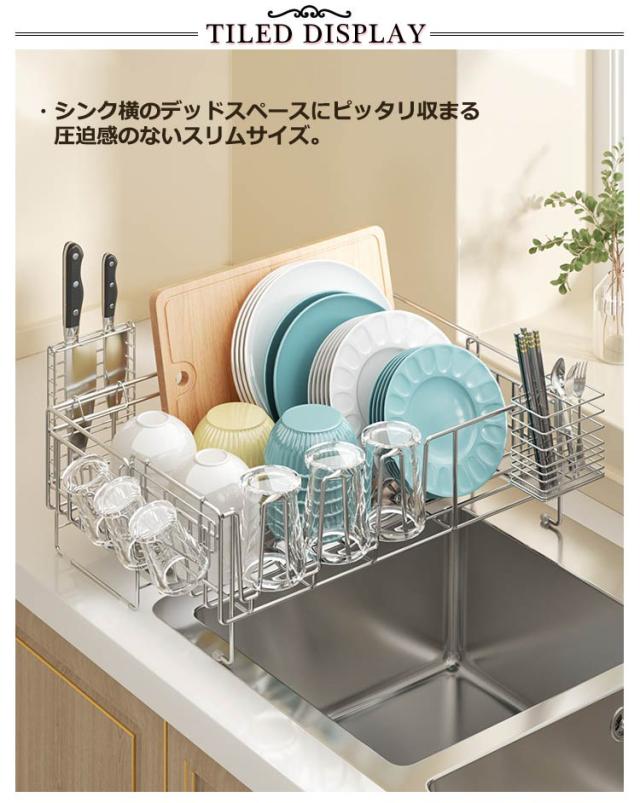 | ・さびにくいステンレス水切り ・シンク横のデッドスペースにピッタリ収まる圧迫感のないスリムサイズ。 ・水切りカゴは伸縮式なので、洗い物の量にあわせて容量をかえられ、省スペースながら大容量。 ・箸立て・グラスホルダー・包丁立て付。 ・絶妙な傾斜の付いたトレイから水が直接シンクに流れる仕組みになっている。 | |