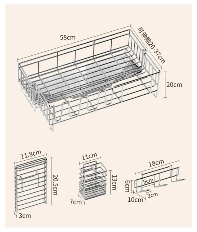 | サイズについての説明 | 【サイズ】幅58cm マチ20?37cm伸縮可能 高さ20cm 【商品仕様】水切りラック本体、箸立て、包丁立て、グラス立て、斜めトレー |