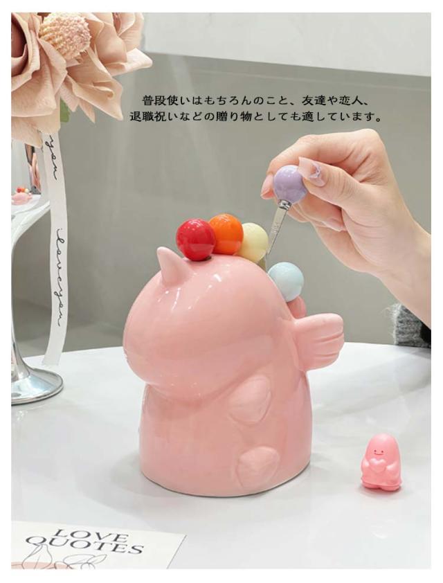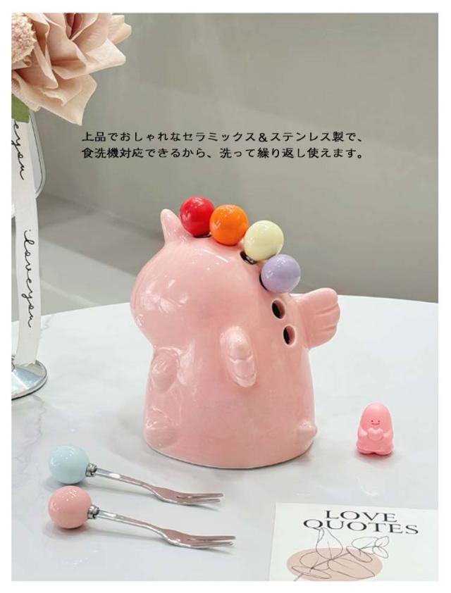 | オブジェとしてもかわいいユニコーン台座付きミニフォークセット。 フルーツやチーズなどのおつまみにピッタリなミニフォーク。 コロンとした持ち手部分が可愛く、持ちやすい。色違いで使い分けもできるから、ご自分専用のフォークにも。 子供用はもちろん、来客用にもおすすめのフルーツフォークです。 人が集まるパーティや食事会、オフィスなどとても便利なミニフォークです。 上品でおしゃれなセラミックス&ステンレス製で、食洗機対応できるから、洗って繰り返し使えます。 普段使いはもちろんのこと、友達や恋人、退職祝いなどの贈り物としても適しています。 食卓に置いているだけで、癒し空間を生み出してくれるフルーツフォークセットです。 | |