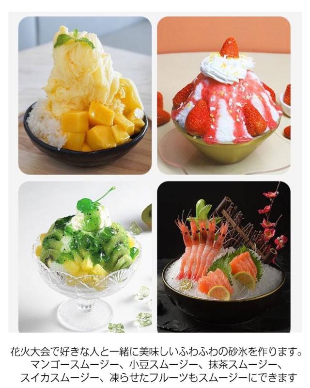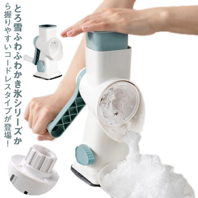 | とろ雪ふわふわかき氷シリーズから握りやすいコードレスタイプが登場! 手回し手動ので、誰でも簡単にかき氷を楽しむことができます。手軽にかき氷がつくれます。出汁やドレッシングを凍らせて料理にも大活躍 場所を取らないので、収納も楽々,簡単に分解ができ、本体以外は水洗い可能でお手入れがしやすいアイテムでどこへでも持ち運べます。 花火大会で好きな人と一緒に美味しいふわふわの砂氷を作ります。マンゴースムージー、小豆スムージー、抹茶スムージー、スイカスムージー、凍らせたフルーツもスムージーにできます | |