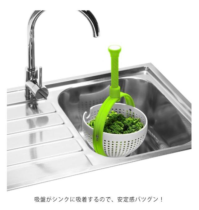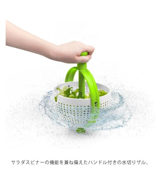| サラダスピナーとザルが一つに♪ サラダスピナーの機能を兼ね備えたハンドル付きの水切りザル。 シンクの中でハンドルを垂直に押し込むと、ザルが回転して遠心力でスピーディーに水を切れます。 吸盤がシンクに吸着するので、安定感バツグン! | |