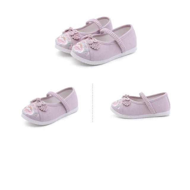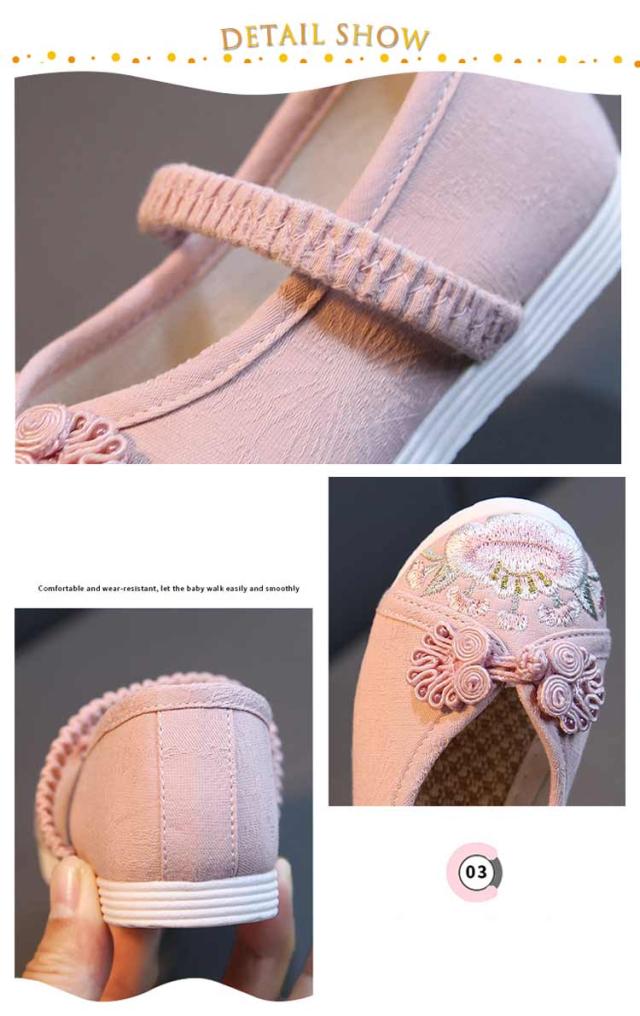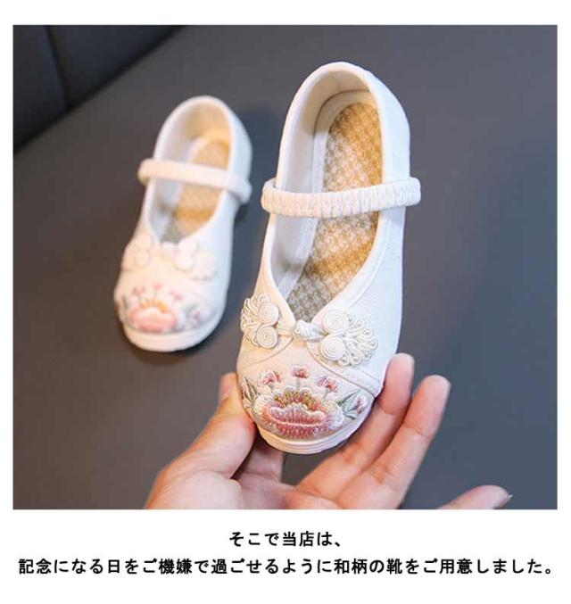 | 草履のかわりに履ける痛くない楽ちん靴。 七五三の女の子の3歳の時には三つ身の被布着物を着ますが、まだまだ小さいので履きなれない草履を嫌がることもあります。 実際に足袋を履いて、草履を履かせてお出かけすると滑って脱げたり、躓いたり。草履で上手に歩くのはまだちょっと難しいよね、というのが本当のところです。 そこで当店は、記念になる日をご機嫌で過ごせるように和柄の靴をご用意しました。 刺繍がされていて、着物ともなじみやすく、非常に軽くて柔らかい靴ですので、神社など段差の多い場所や砂利道もへっちゃらで機嫌よく歩いてくれますよ。 七五三が終われば、飾りを取って普段の靴として履いても可愛いです。 | |