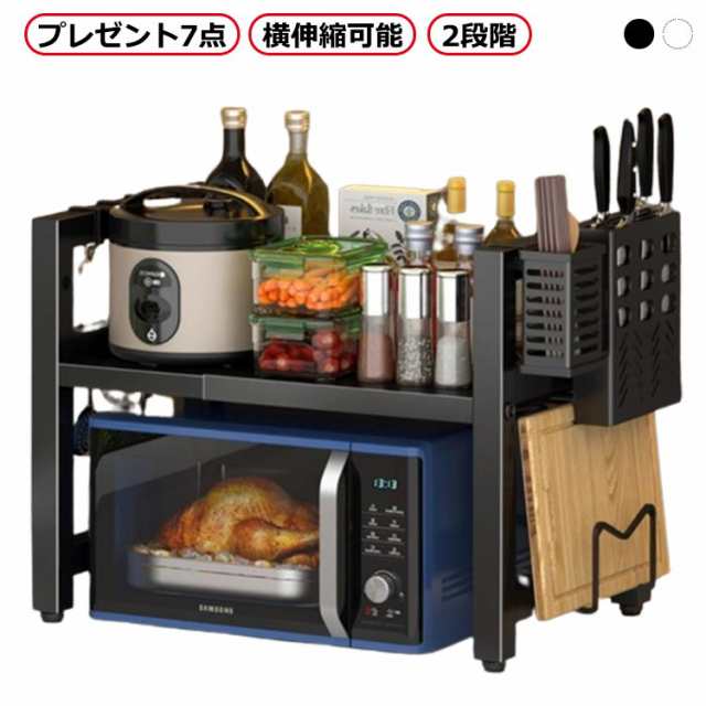| プレゼント7点 横伸縮可能 2段階 電子レンジへかぶせるように置くだけで、上の空きスペースを収納に活かせるレンジ上ラック。 こちらのラックを使えば、上部のスペースを有効活用することができます。 耐荷重は約75kgなので、キッチン家電や小物、調味料など置ける丈夫さ。 幅は約40?63cmの間で伸縮でき、レンジの大きさやスペースに合わせて幅を調節できます。 棚の高さは2段階調節ができるます。棚下の高さは最大で(約)43cmにでき大型レンジや背の高い調理器具などを収納することができます。 フレームはスチール製で安定感があります。 サイドにフックが付いて、お玉などのキッチンツールなどを掛けるのに便利 シンプルなデザインだから圧迫感がありません。 | |
