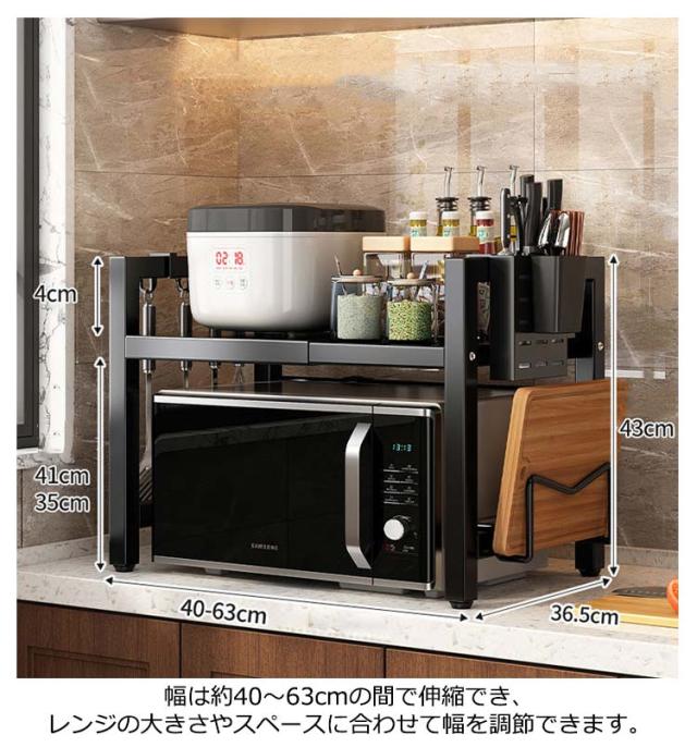 レンジ上ラック 高さ 調節 2段階調整 幅40-63cm(伸縮可能) 伸縮レンジラック レンジ上 ラック キッチンラック レンジ台 レンジ棚 1段 キッチン収納 大型レンジ対応 電子レンジ台 トースター 炊飯器 ラック レンジ置台 カウンター上 収納 卓上