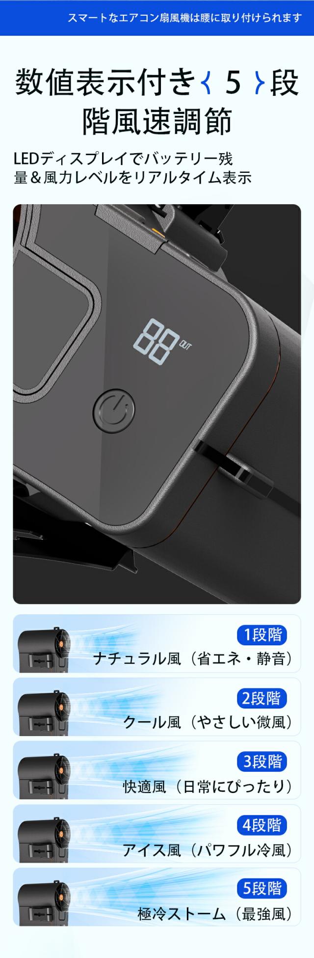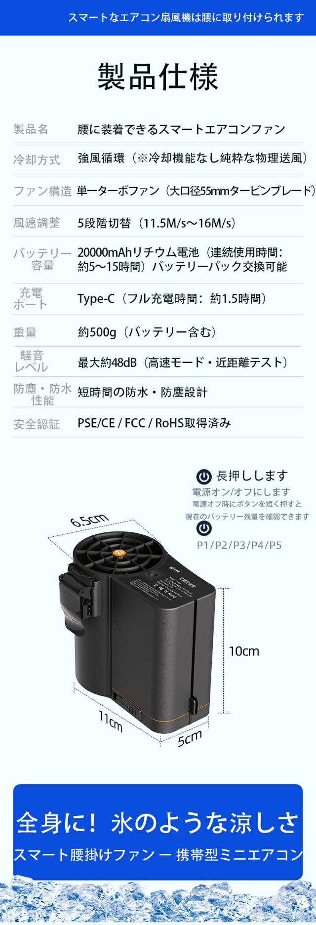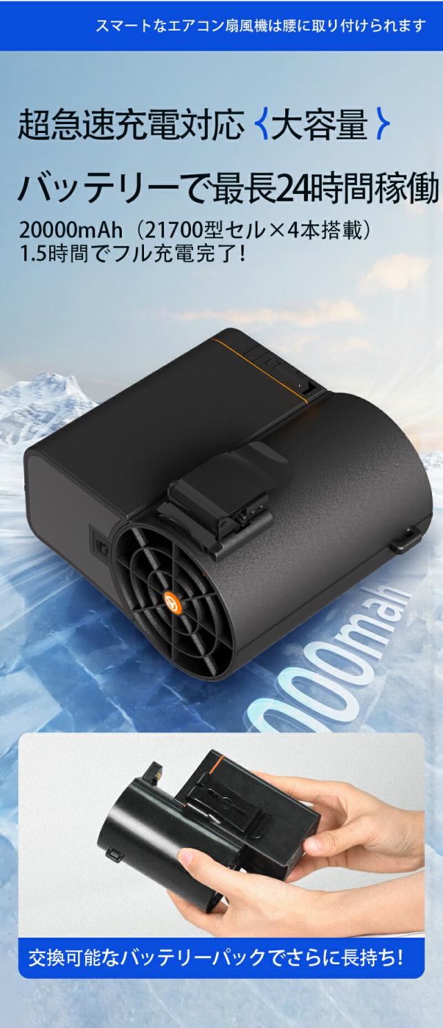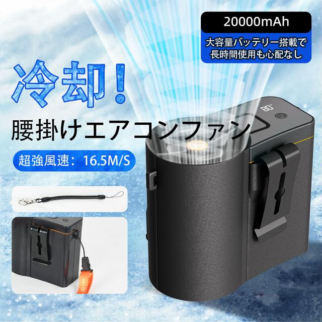 腰掛け扇風機 ポータブルファン 冷却プレート付 強風 静音 充電式 20000mAh大容量 USB PD30W対応 ウエストファン 熱中症対策 アウトドア 工場 作業用 ストラップ付き 小型 軽量 夏 快適グッズ