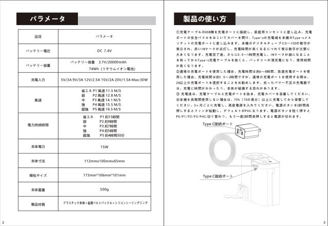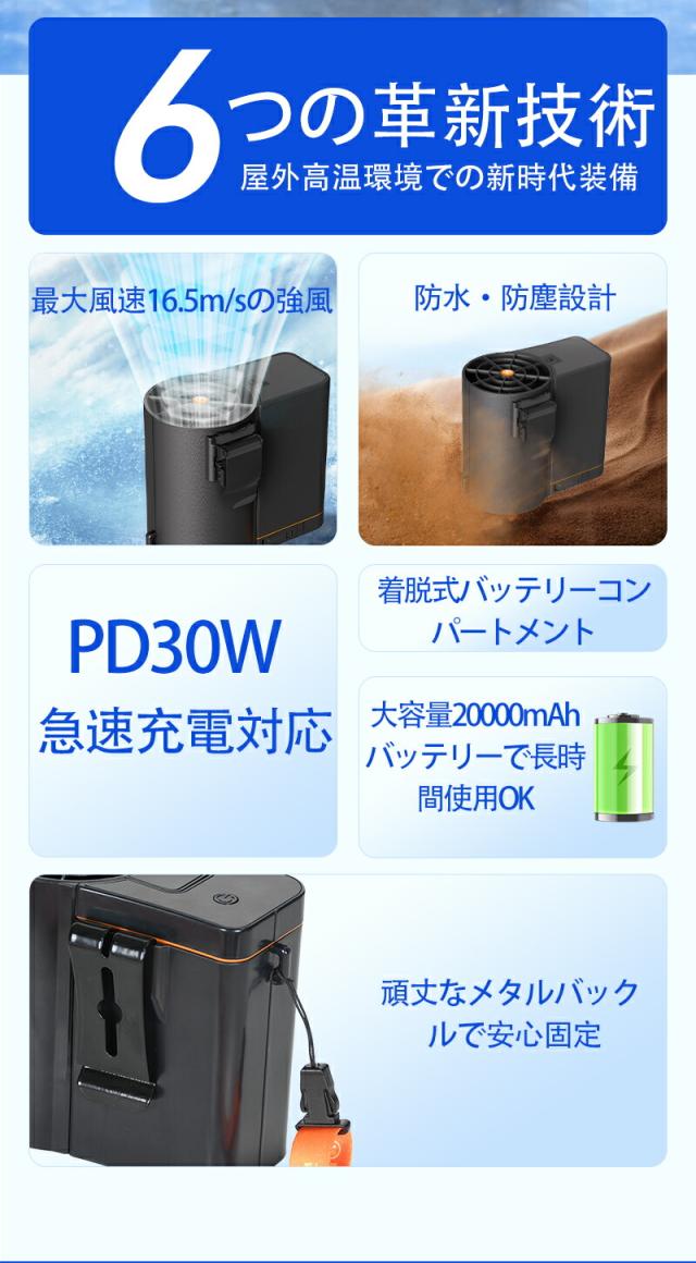 | 主な機能 | 最大風速16.5m/sの強風 PD30W急速充電対応 防水?防塵設計 着脱式バッテリ-コンバ-トメント 大容量20000mAhバッテリ-で長時間使用OK 頑丈なメタルレバックルで安心固定 |