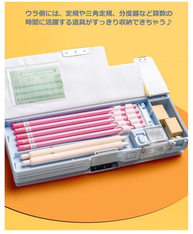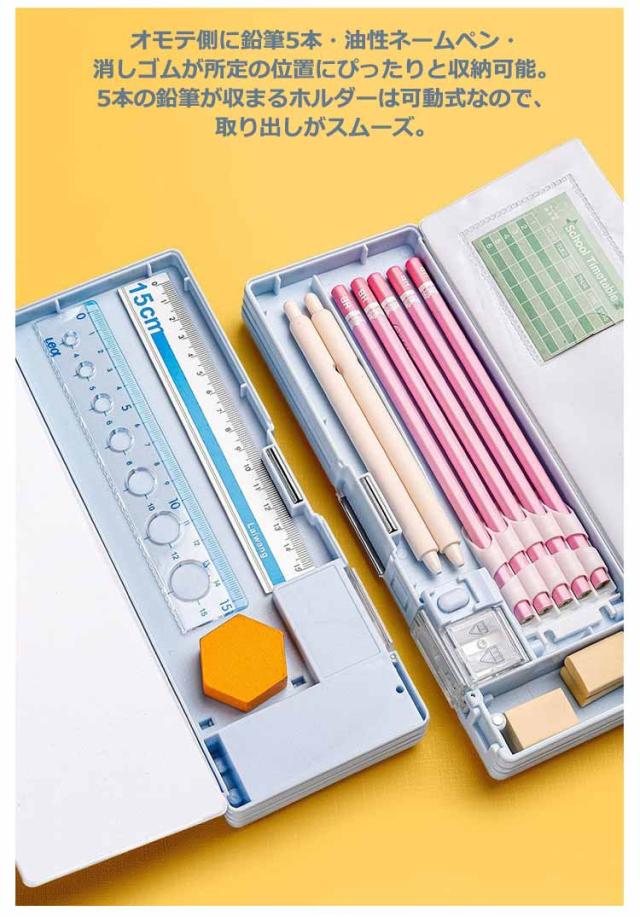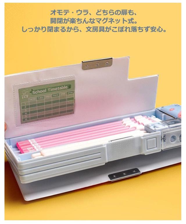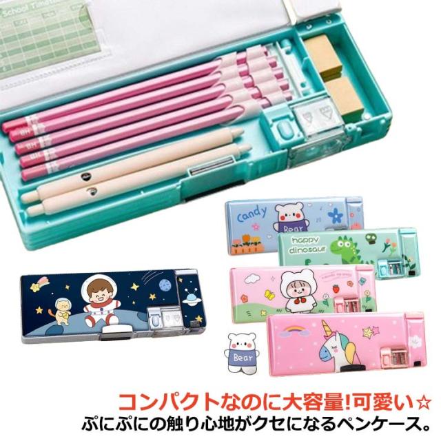 | コンパクトなのに大容量!!可愛い☆ぷにぷにの触り心地がクセになるペンケース。 両面開きで使いやすいボックス型筆箱。スリムで軽量なのにたっぷり収納できちゃうのが嬉しい♪ オモテ側に鉛筆5本・油性ネームペン・消しゴムが所定の位置にぴったりと収納可能。5本の鉛筆が収まるホルダーは可動式なので、取り出しがスムーズ。 消しゴム用スペースには、取り外しのできる鉛筆削り器が付属していて、とっても便利! ウラ側には、定規や三角定規、分度器など算数の時間に活躍する道具がすっきり収納できちゃう♪ オモテ・ウラ、どちらの扉も、開閉が楽ちんなマグネット式。しっかり閉まるから、文房具がこぼれ落ちず安心。 | |