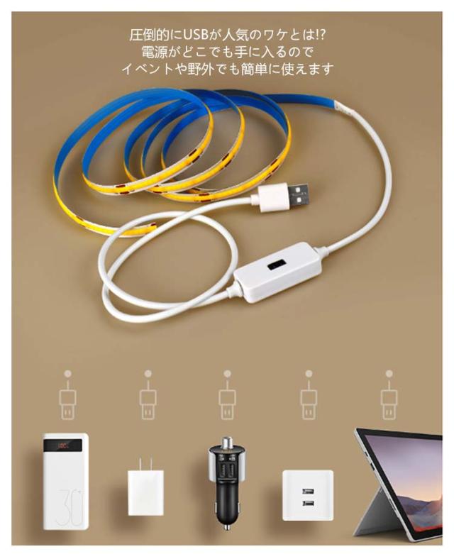 テープライト USB 2m LED 間接照明 ledテープライト cob 室内 屋外 照明 イルミネーション ライト 電球色 昼光色 防水 スイッチ 粘着テープ 5v 低圧 安全 棚下照明 切断可能 高輝度 全面発光 クリスマス 装飾 寝室 店舗 玄関 足元灯 部屋 DIY